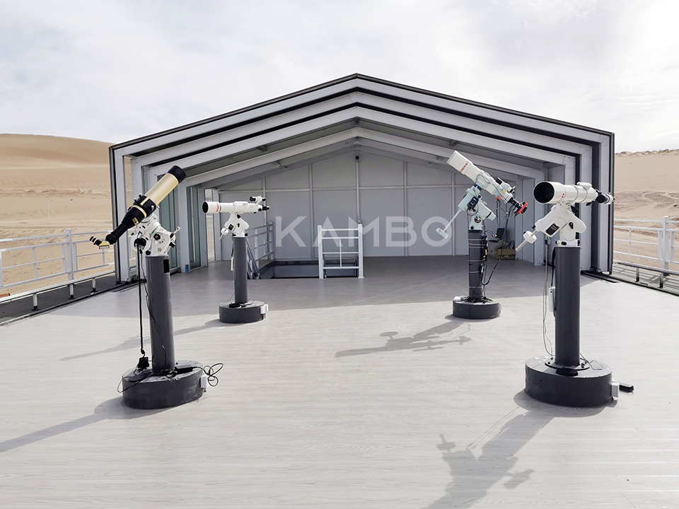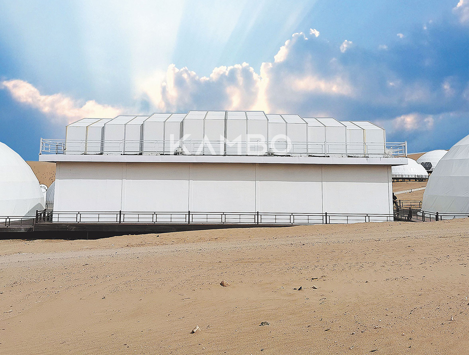 The overall design of the Star Picking Town is centered around the "Milky Way" axis, connecting and running through the entire town while separating various functional layouts, allowing the dazzling starry sky of the desert to complement high-tech buildings. The intelligent mobile sunroom in the Starry Sky Exploration functional area, designed and constructed by our company, is located in the center of the scenic area. It has a two-story structure and is designed to resist blizzards, sandstorms, and ultraviolet rays. When night falls, the modular sunroom can slowly move and shrink to both sides, and under the starry sky, visitors can use astronomical telescopes to explore the mysteries of space.